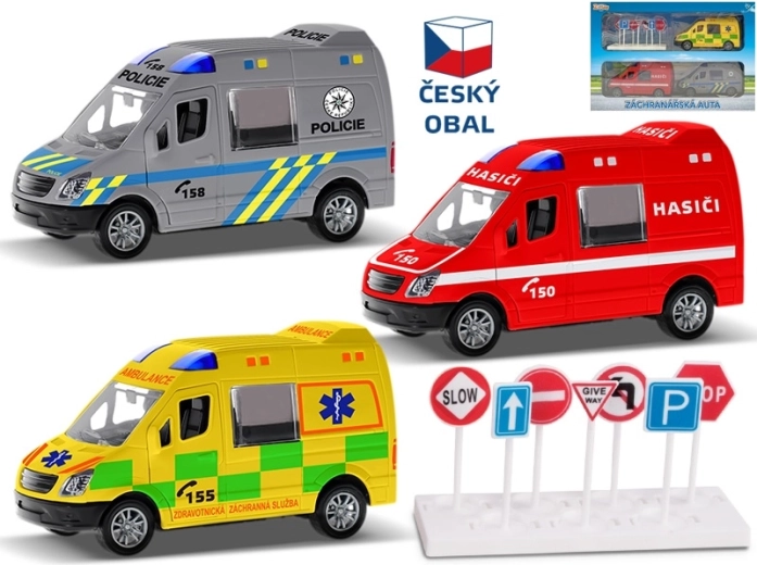 - 3× auto (straż pożarna, karetka, policja) + znaki drogowe