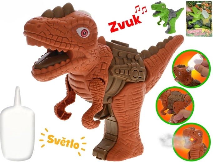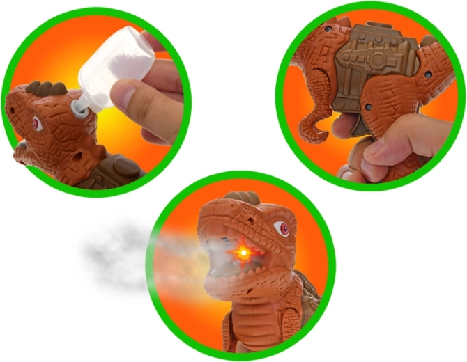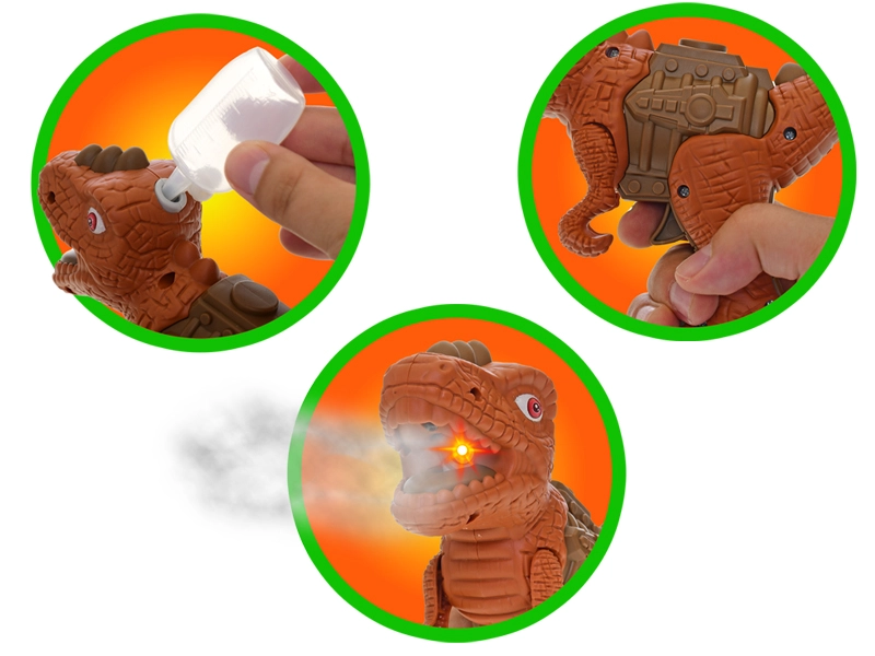 Zabawka jest dostępna w dwóch kolorach – pomarańczowym i zielonym, więc każdy mały odkrywca z łatwością wybierze swojego dinozaura. Dzięki kompaktowym wymiarom świetnie sprawdzi się w podróży i podczas domowej zabawy. Do działania potrzebne są 2× baterie AA (nie są dołączone do zestawu), a w komplecie znajduje się także pojemniczek do uzupełniania wody.