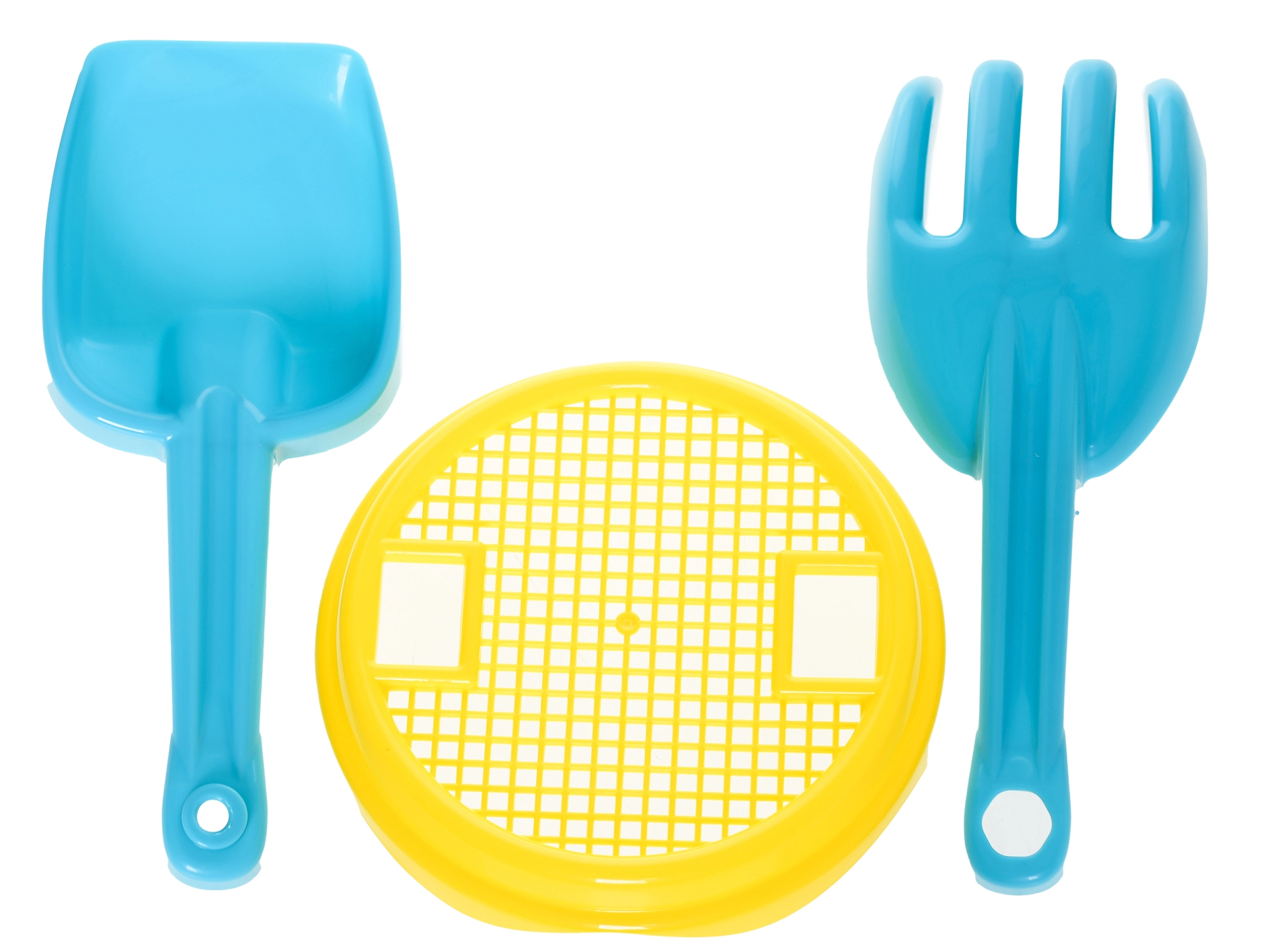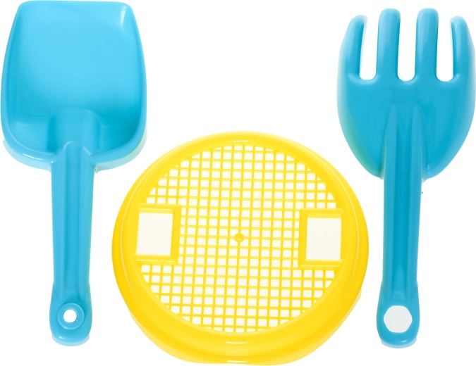 - Kompletny 5‑elementowy zestaw: wiaderko, sito, łopatka, grabki i foremka