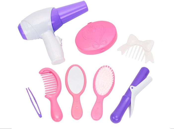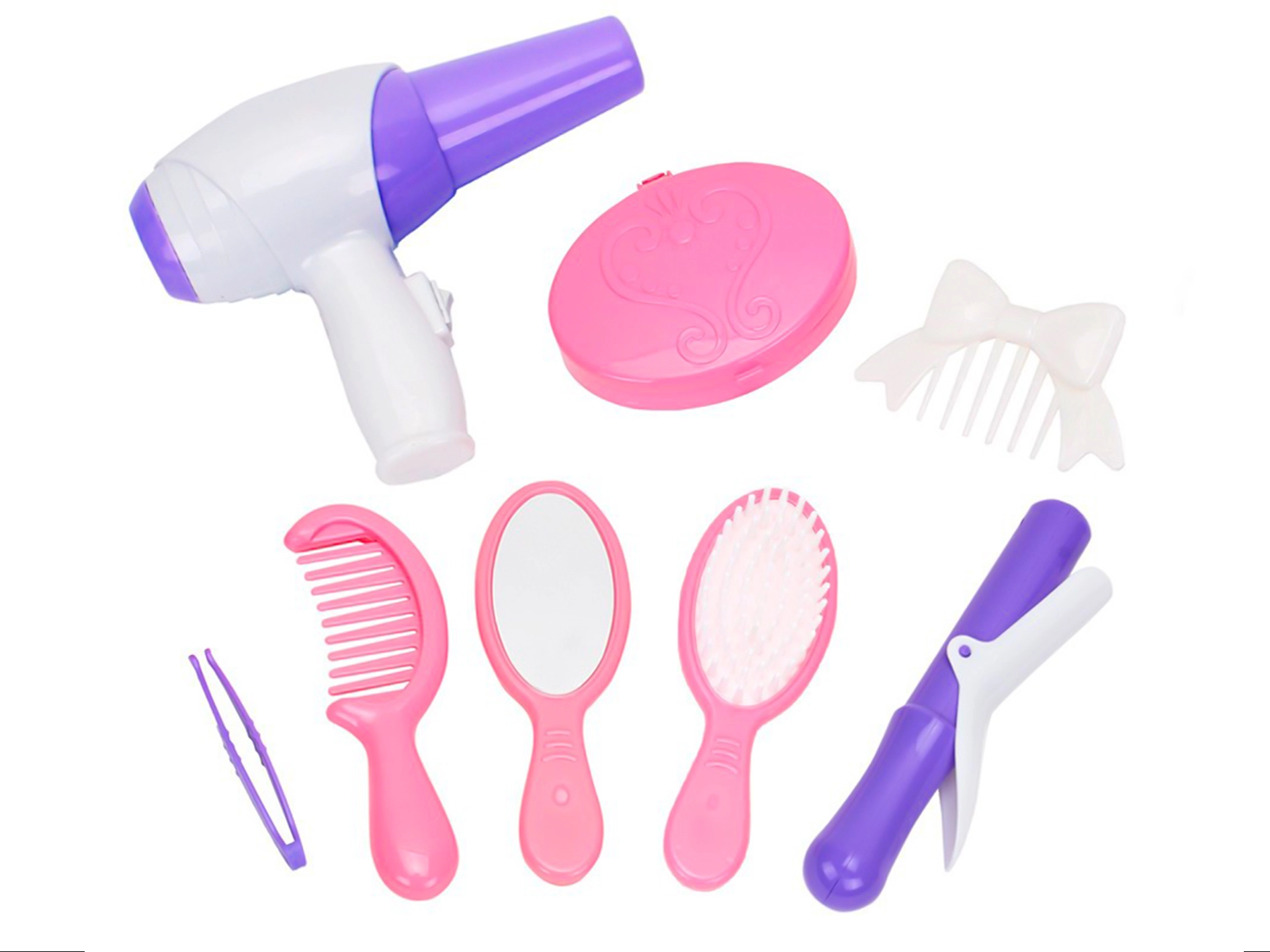 - Suszarka, lokówka, grzebień, szczotka, lusterko, grzebyk z kokardką, puderniczka, pęseta