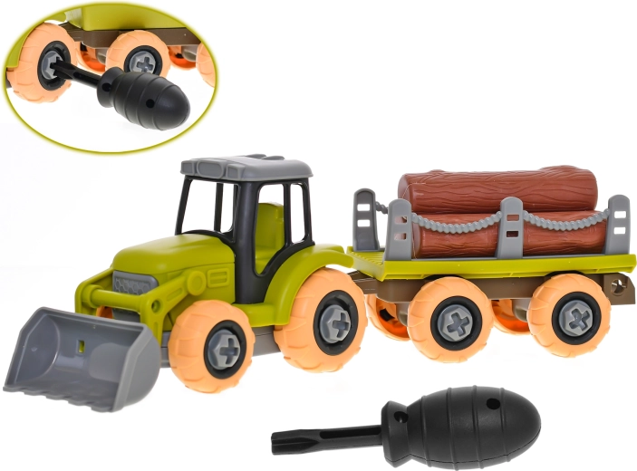 Odkryj zabawkę dla małych farmerów: traktor do skręcania z przyczepą i kłodami o długości 28 cm. Dzięki mechanizmowi skręcania dzieci mogą samodzielnie złożyć i rozłożyć pojazd, co rozwija małą motorykę i umiejętności techniczne. Wolnobieżny napęd zapewnia płynny i cichy ruch po podłodze, a wytrzymały plastikowy materiał gwarantuje długą żywotność.