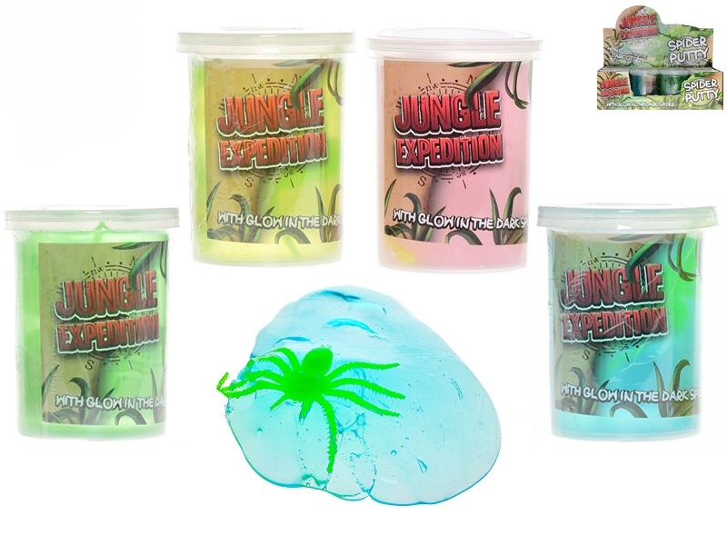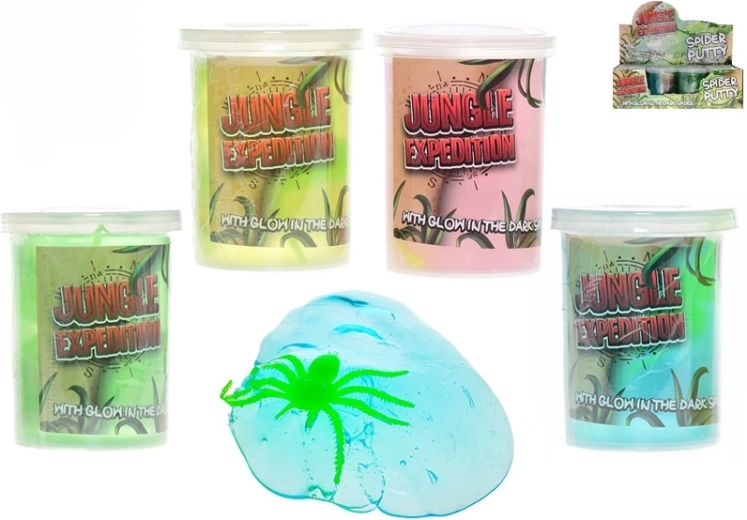Jungle Expedition świecący slime z pająkiem to świetny wybór dla małych odkrywców. W kolorowej masie ukryty jest mały pająk, który po naświetleniu świeci w ciemności, dodając zabawie tajemniczej atmosfery. Dzięki kompaktowemu, przezroczystemu kubeczkowi slime jest łatwy do przenoszenia i zawsze gotowy do zabawy w domu i w podróży.