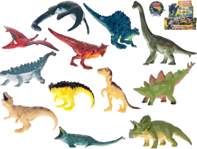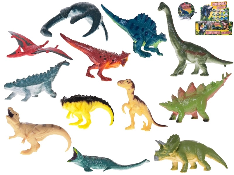 - Pterodaktyl, Triceratops, Brachiozaur, Stegozaur, T‑Rex, Plezjozaur, Karnotaur, Spinozaur, Giganotozaur, Ankylosaurus, Welociraptor, Mozazaur