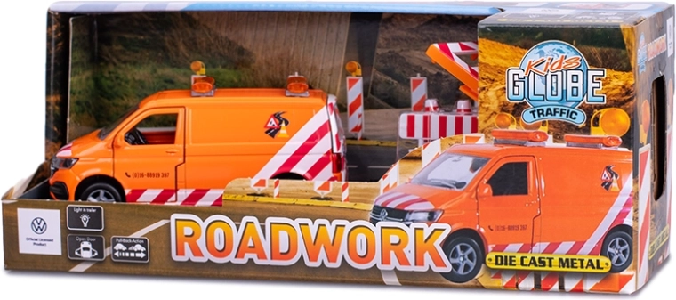 Realistyczny metalowy model VW Transporter od Kids Globe Traffic o długości 27 cm zapewnia dzieciom interaktywną zabawę z napędem typu pull-back, efektami świetlnymi i dźwiękowymi. Wytrzymałe wykonanie z plastikowymi detalami, odpowiednie dla dzieci od 3 lat, dostarczane w praktycznym pudełku.