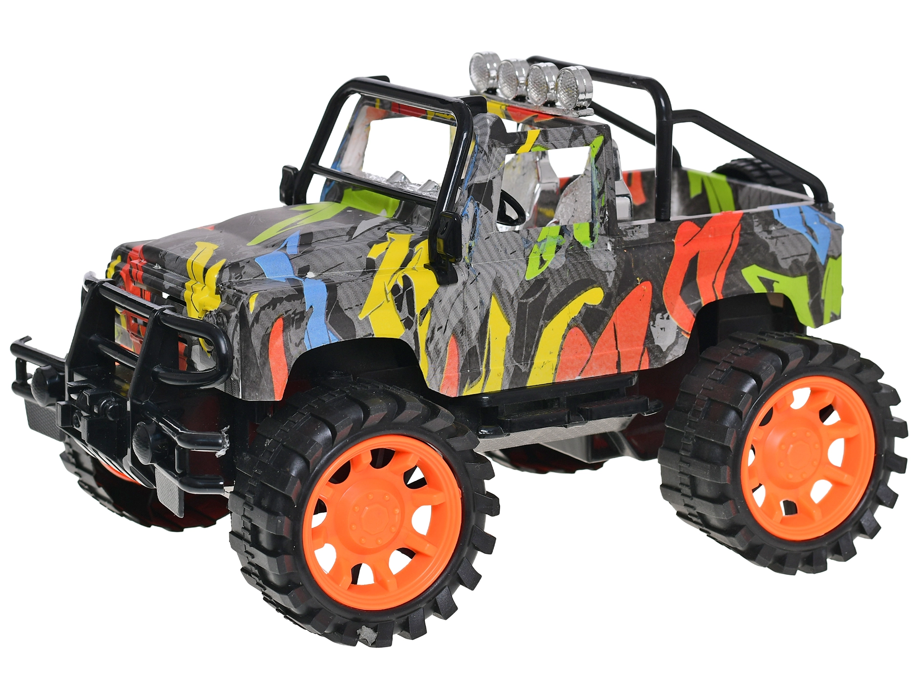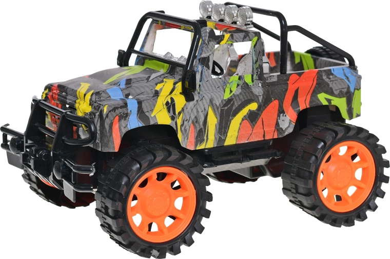 Stylowy plastikowy model auta terenowego w skali 1:14 zachwyca nowoczesnym wzorem graffiti i zapewnia długotrwałą zabawę bez baterii. Dzięki napędowi z kołem zamachowym jest łatwy w prowadzeniu, ma długość 26 cm dla realistycznych wrażeń z jazdy i jest odpowiedni dla dzieci od 3 lat.