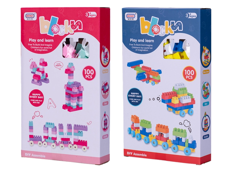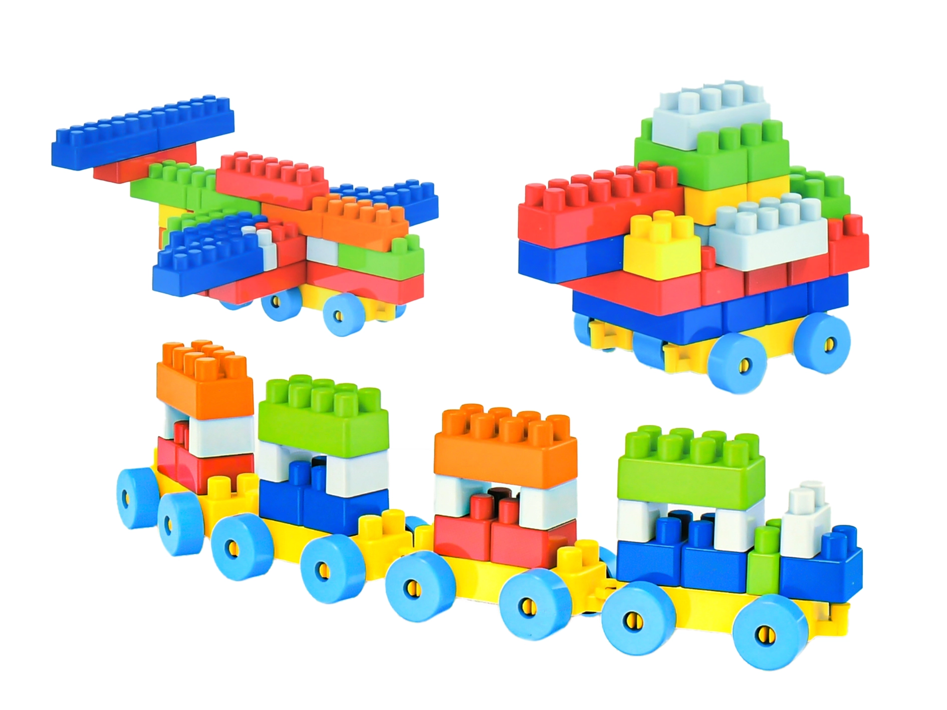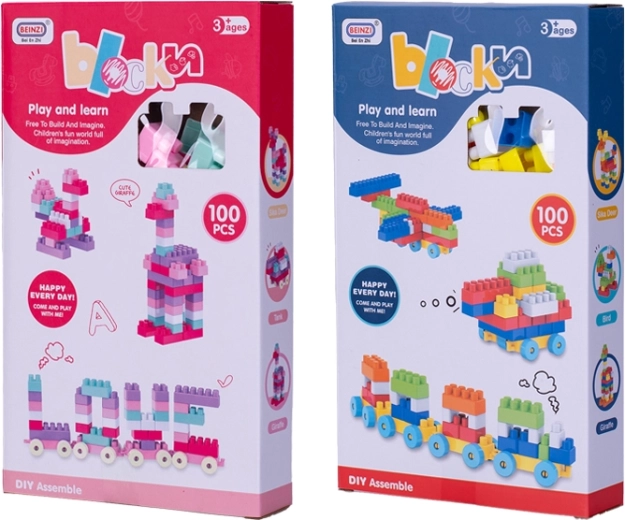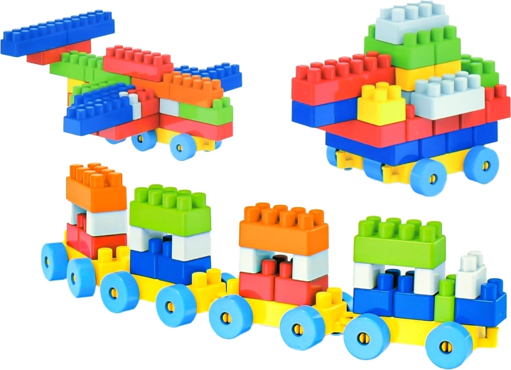 Ten uniwersalny zestaw konstrukcyjny oferuje 100 solidnych plastikowych elementów, w tym podwozia z kołami do łatwego tworzenia jeżdżących modeli. Dzieci mogą zbudować własny pociąg z wagonikami, samochodzik lub mały samolot i dowolnie je łączyć.