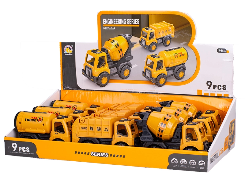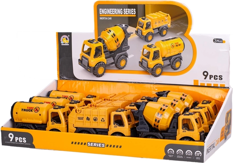 Zabawny zestaw pojazdów budowlanych na napęd inercyjny ucieszy małych budowniczych od 3 lat. Zawiera betoniarkę, cysternę i kontener o długości 15 cm. Dzięki napędowi inercyjnemu wystarczy popchnąć pojazd i puścić – sam ruszy do przodu. Wytrzymały plastik zapewnia długą żywotność i bezpieczną zabawę w domu, w ogrodzie i w piaskownicy. Praktyczne opakowanie 9 sztuk w displayu jest idealne do kącików dziecięcych oraz większych grup dzieci.