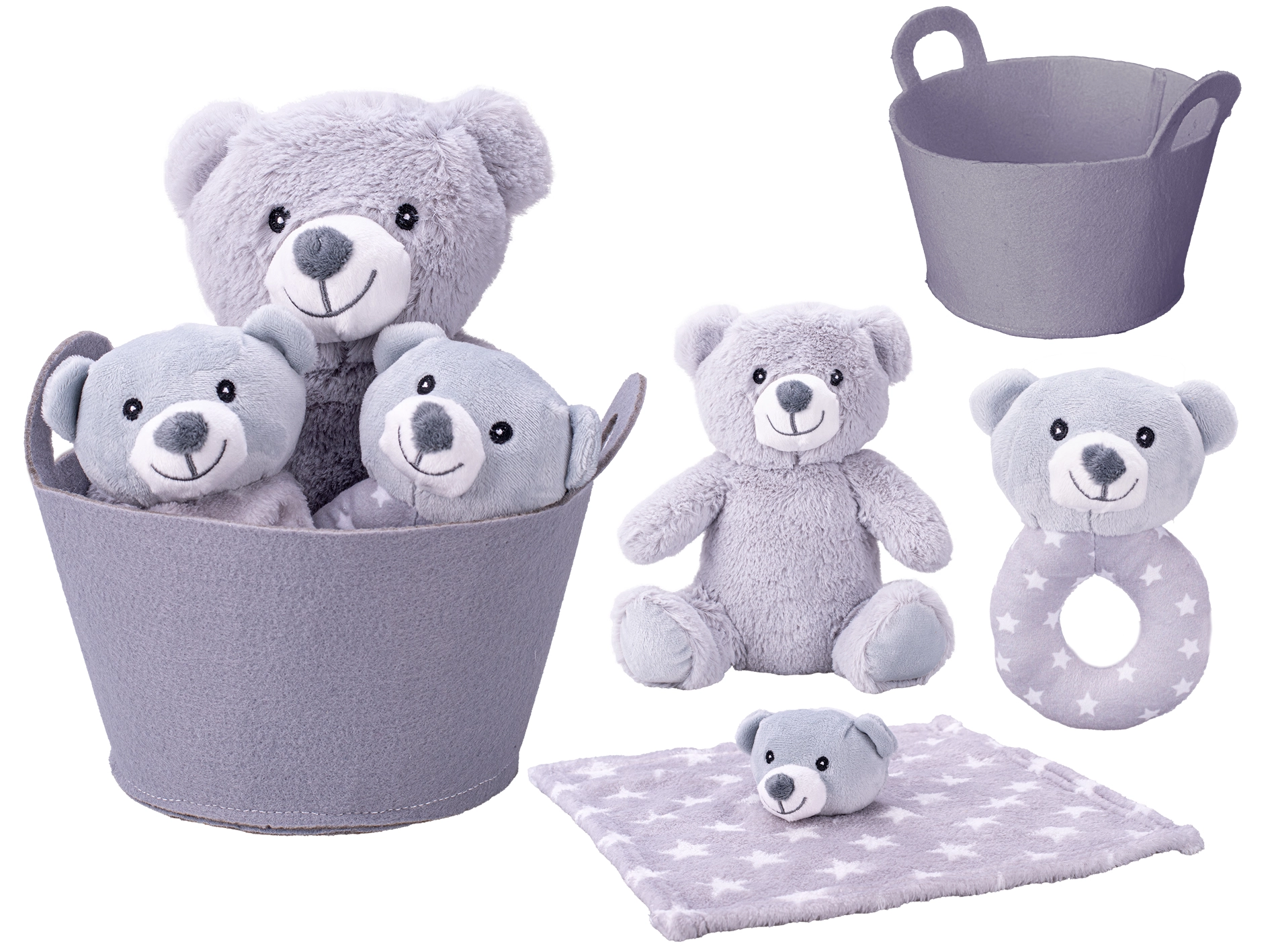 Uroczy zestaw prezentowy dla noworodka zawiera mięciutkiego szarego pluszowego misia 20 cm, grzechotkę 13 cm wspierającą rozwój zmysłów oraz delikatną przytulankę do zasypiania dla spokojnego snu. Wszystko jest elegancko ułożone w dekoracyjnym koszyku, który można wykorzystać także jako praktyczne miejsce do przechowywania. Wykonane z wysokiej jakości i bezpiecznego pluszu, odpowiednie od urodzenia.