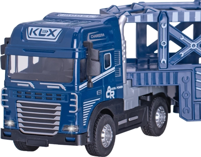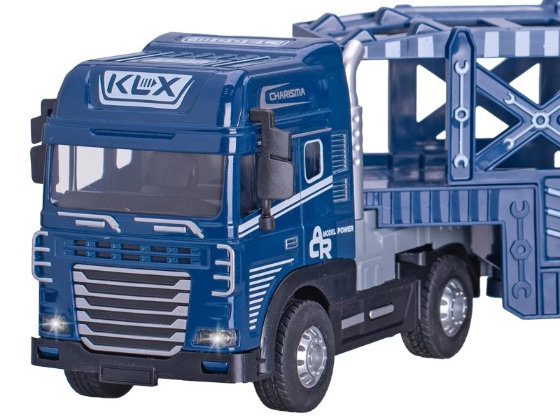 Realistyczny transporter samochodów w skali 1:24 o długości 40 cm łączy metalowe i plastikowe elementy dla trwałości i detalu. Dzięki napędowi na inercję płynnie rusza do przodu bez potrzeby baterii do jazdy. Zabawy dodają efekty świetlne i dźwiękowe, zasilane 3× bateriami LR44 w zestawie. Dostępny w dwóch kolorach – niebieskim i pomarańczowym, idealny dla dzieci od 3 lat.