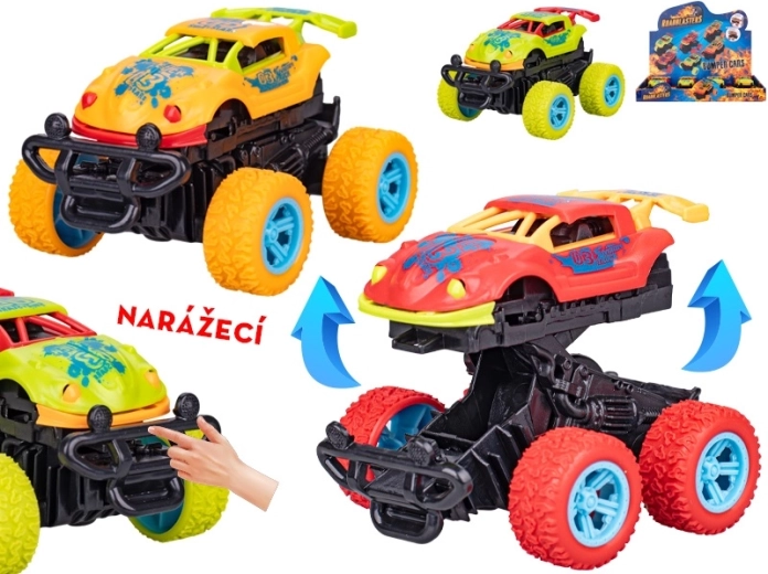 Akcyjny zderzakowy samochodzik Roadblasters o długości 9 cm zapewnia dzieciom dynamiczną zabawę i rozwój motoryki. Dzięki napędowi bezwładnościowemu po naciągnięciu jedzie do przodu, a przy zderzeniu automatycznie wraca. Solidna plastikowa konstrukcja gwarantuje wytrzymałość i długą żywotność. Dostępne są 2 typy nadwozia i 3 wyraziste kolory.