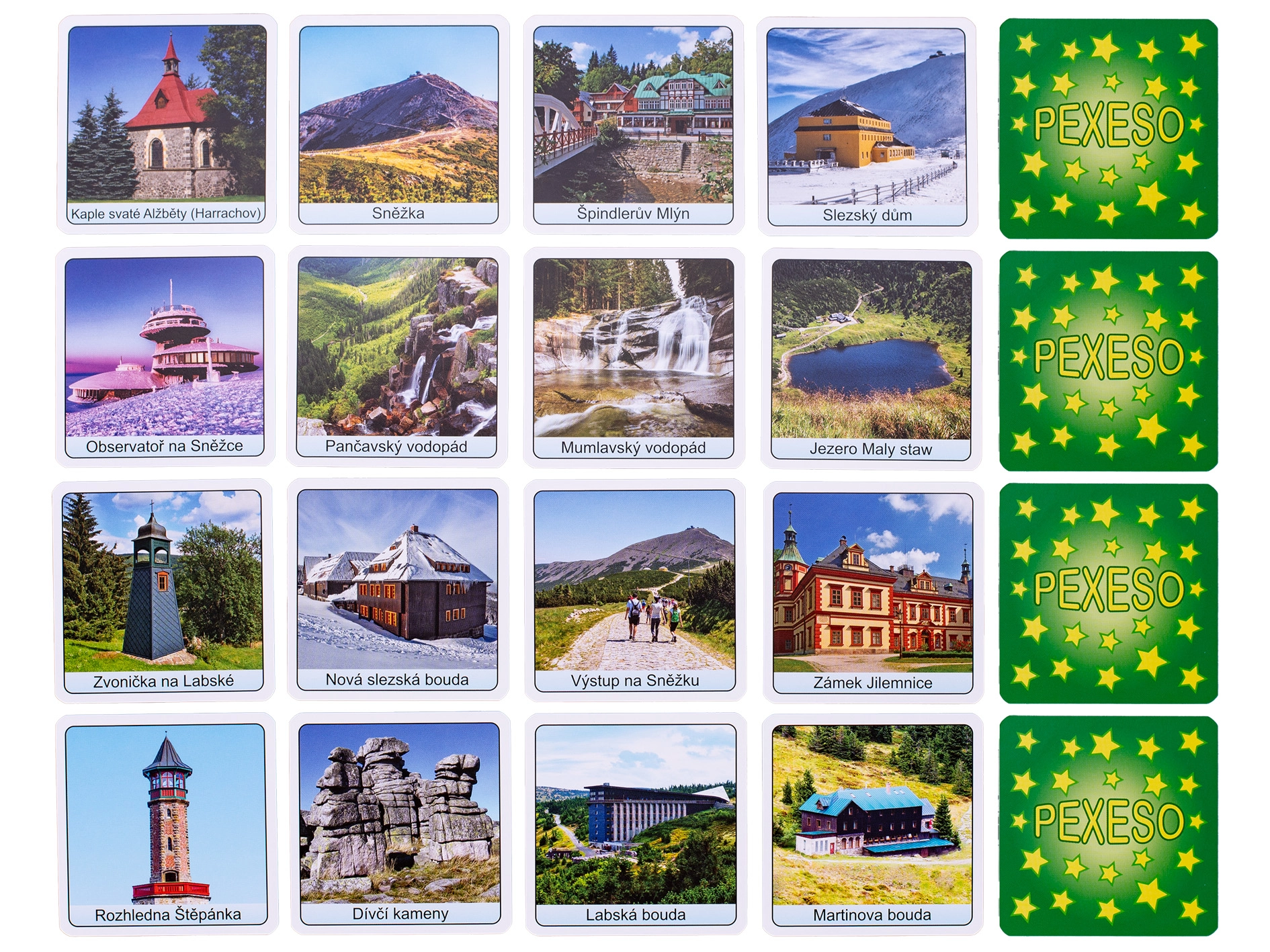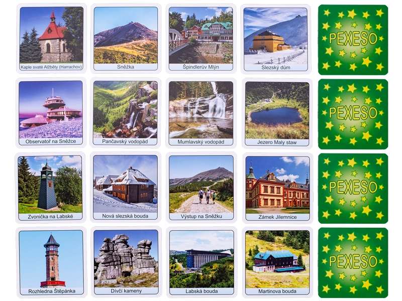 Pexeso Karkonosze to lubiana gra pamięciowa z oryginalnymi motywami najwyższego czeskiego pasma górskiego. Dzieci i dorośli ćwiczą koncentrację, pamięć i cierpliwość, odkrywając malownicze miejsca, takie jak Śnieżka, Labský důl czy Černá hora. Dzięki kompaktowemu pudełku pexeso to idealny towarzysz podróży, wakacji i weekendowych wypadów.