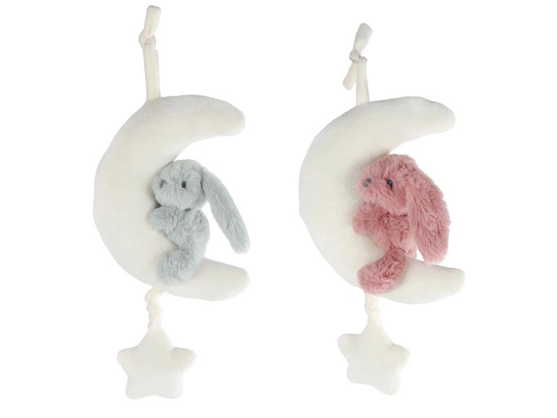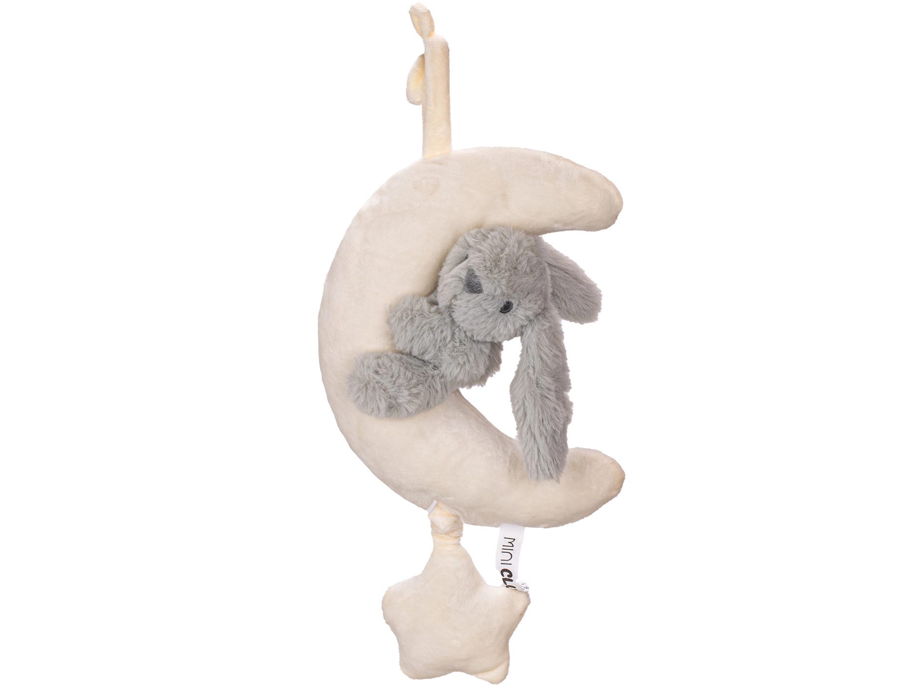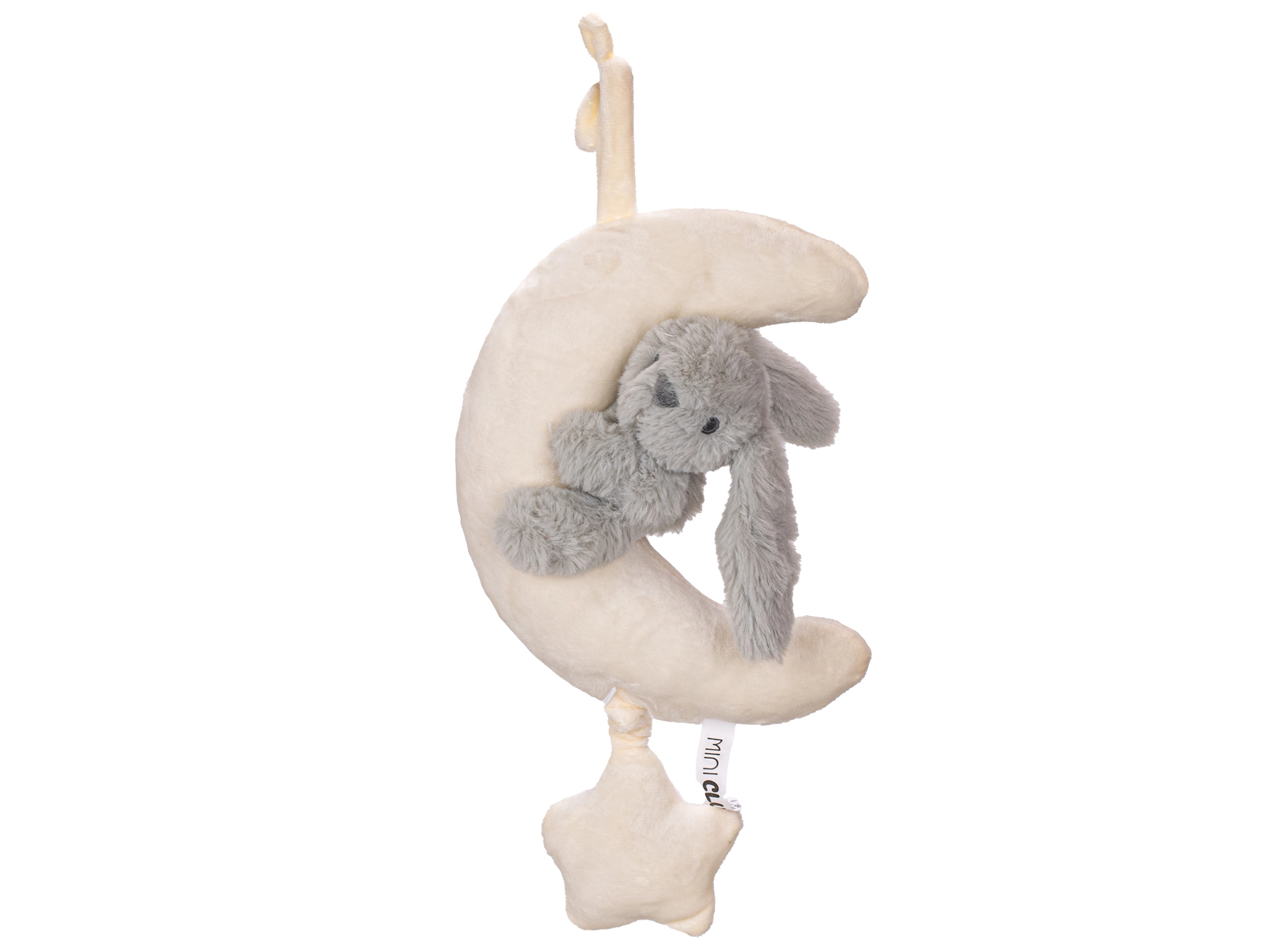 Wprowadź do dziecięcego świata łagodne światło księżyca i przytulność pluszu. Ta zawieszana zabawka w kształcie księżyca z uroczym króliczkiem zachwyca miękką powierzchnią, a po nakręceniu oferuje delikatną melodię do spokojnego zasypiania. Dzięki lekkiej konstrukcji łatwo przymocujesz ją do łóżeczka, wózka lub pałąka.