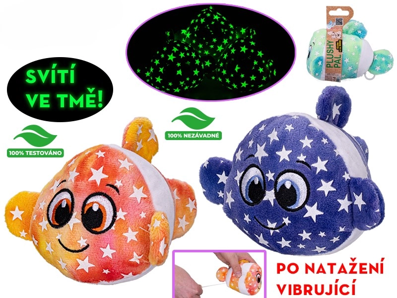 Urocza pluszowa rybka o długości 10 cm to miękki i bezpieczny towarzysz dla maluszków już od urodzenia. Po naciągnięciu delikatnie wibruje, a jej fosforyzujące elementy świecą w ciemności, co uspokaja i ułatwia zasypianie. Dostępna w trzech kolorach – zielonym, fioletowym i pomarańczowym – z łatwością mieści się w łóżeczku i wózku, a przy tym naturalnie stymuluje zmysły i motorykę najmłodszych.