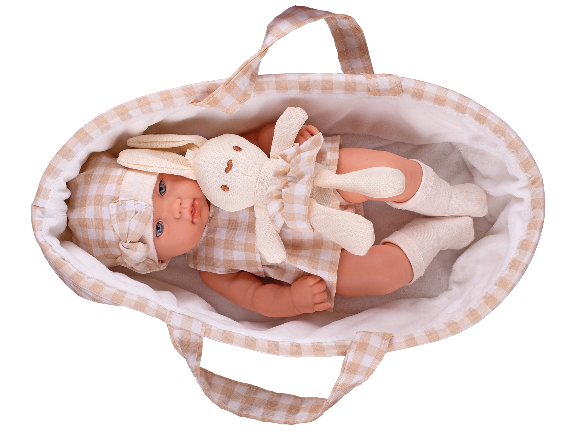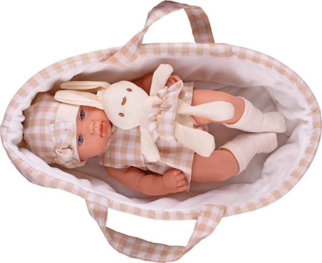 - Kompletny zestaw: lalka, nosidełko i pluszowy króliczek w dopasowanych beżowych odcieniach.