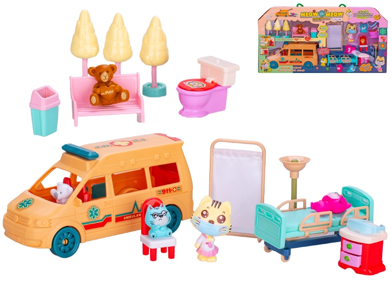 - Auto (ambulans), 5 figurek zwierzątek, szpitalne łóżko, stolik, ławeczka, krzesło i inne akcesoria
