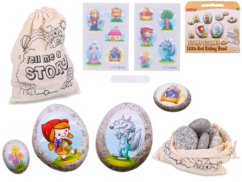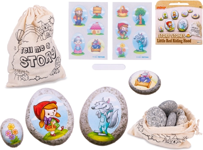 - 10 kamyków, naklejki z motywami z bajki o Czerwonym Kapturku