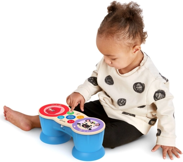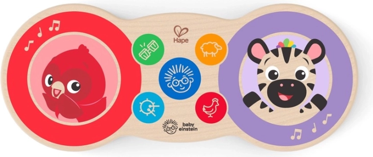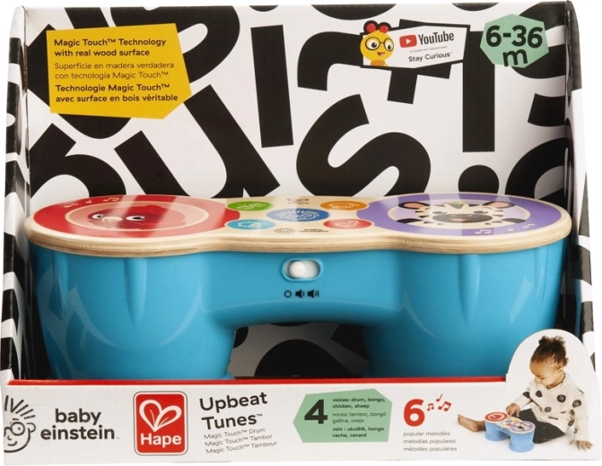 Odkryj radość z muzyki z dziecięcymi bębenkami Baby Einstein Magic Touch Upbeat Tunes. Drewniana powierzchnia z technologią Magic Touch reaguje na delikatny dotyk i pozwala dzieciom od 6 miesięcy grać klasyczne melodie, przełączać dźwięki bębna i bongo oraz zabawne odgłosy zwierzątek. Naciśnięcie przycisku Einsteina uruchamia 6 ulubionych melodii. Świetna zabawka do rozwoju małej motoryki, poczucia rytmu i kreatywnej ekspresji.