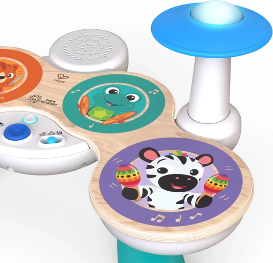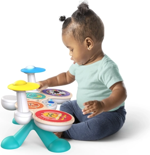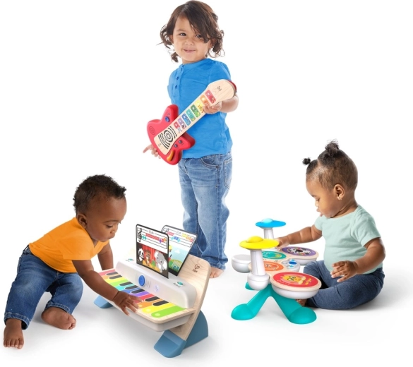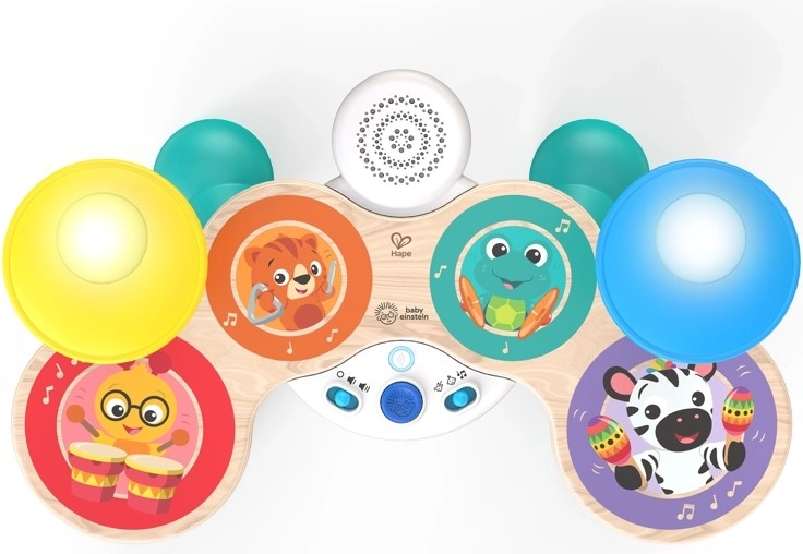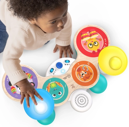 Dziecięcy zestaw perkusyjny BABY EINSTEIN x HAPE Together in Tune to sprytna zabawa dla najmłodszych. Drewniany wygląd i trwałe wykonanie uzupełnia nagradzana technologia Magic Touch, dzięki której nawet lekki dotyk malowanych powierzchni uruchamia autentyczne dźwięki bębnów. Dzięki połączeniu bezprzewodowemu dzieci mogą zagrać solo lub wspólnie z pianinem i gitarą z tej samej serii, tworząc mały domowy zespół.