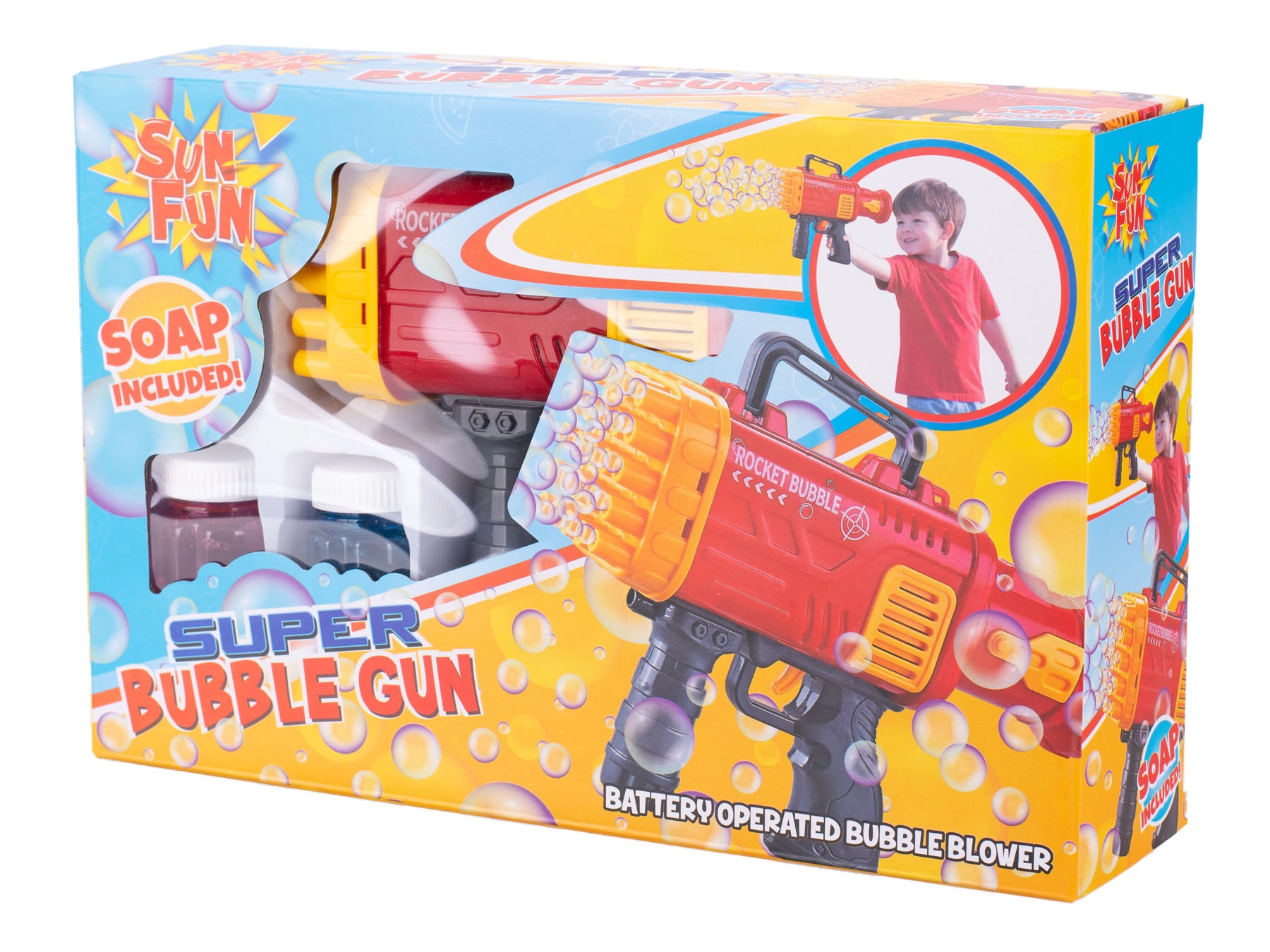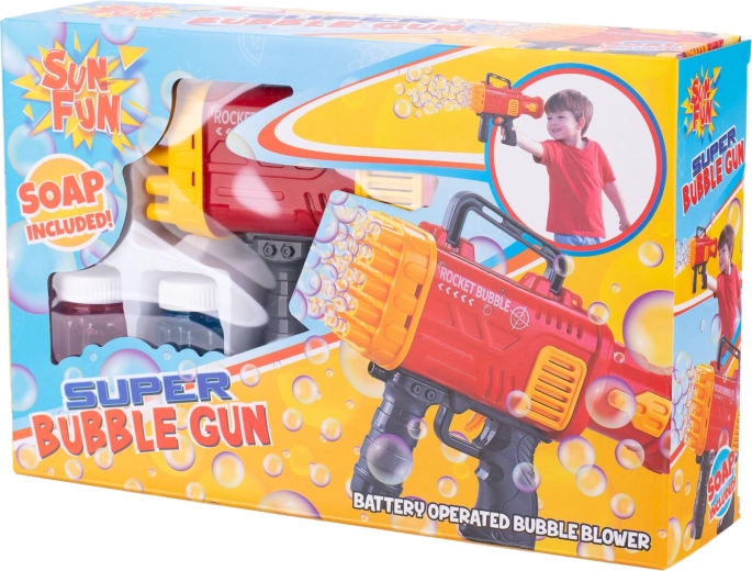Spraw dzieciom radość pistoletem do baniek Sun Fun, który tworzy mnóstwo baniek po prostu po naciśnięciu spustu. Dzięki łatwej obsłudze, wygodnemu uchwytowi i atrakcyjnemu wzornictwu jest idealny na zabawy na świeżym powietrzu, uroczystości i letnie atrakcje. Wystarczy włożyć baterie (nie są dołączone), podłączyć wkład i zabawa zaczyna się.