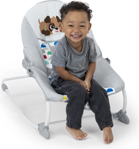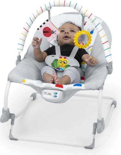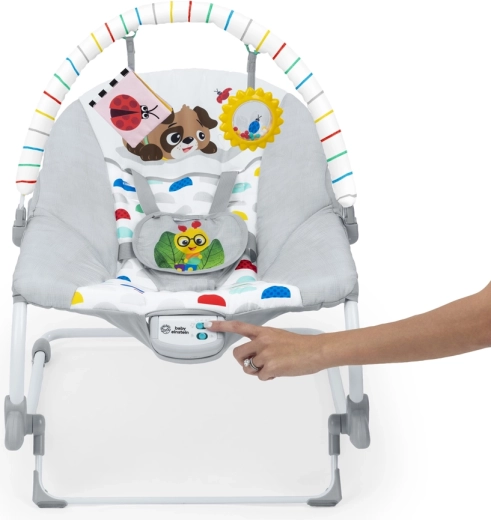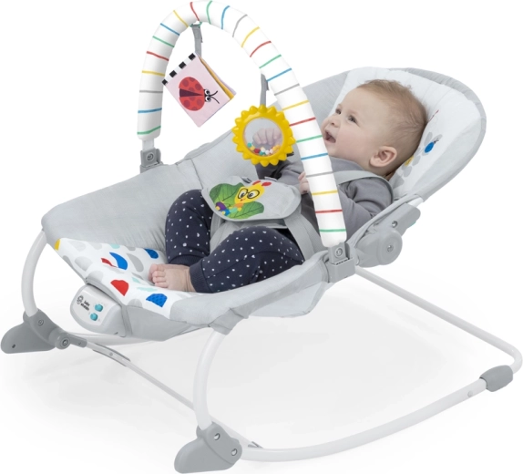 Odłączany pałąk z grzechotką i szeleszczącą książeczką wspiera wzrok, słuch oraz małą motorykę. Można go łatwo zdjąć do trybu bujaczka dla malucha.