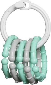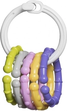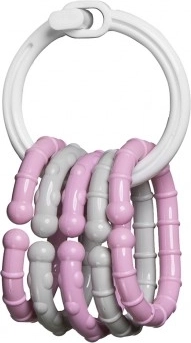 Lekki pierścień dobrze leży w dłoni, a zawieszki łatwo się trzyma. Dziecko podczas zabawy ćwiczy chwyt, zręczność i manipulację przedmiotami.