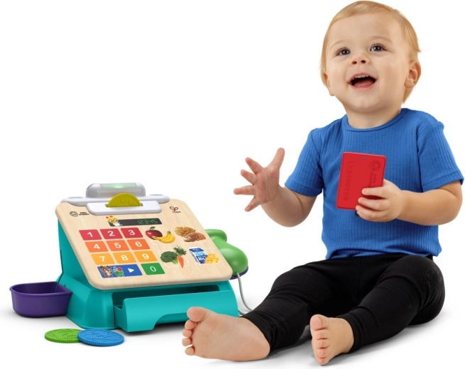 Interaktywna kasa dla dzieci z technologią Magic Touch łączy drewno z certyfikatem FSC i wytrzymały plastik dla bezpiecznej, sensorycznej zabawy. Oferuje światełka, melodie, dźwięki kasy i wypowiadane frazy, uczy liczb i produktów spożywczych w czterech językach oraz wspiera małą motorykę i zabawy w odgrywanie ról. W zestawie skaner, karta kredytowa i 3 monety oraz praktyczna szuflada do przechowywania akcesoriów.