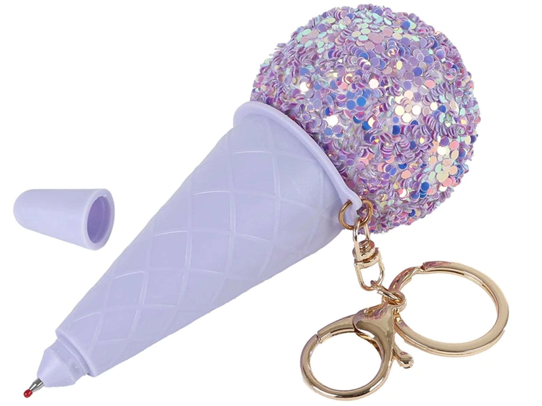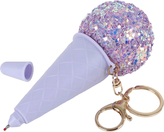 Stylowy brelok do kluczy Glamour w kształcie loda łączy praktyczny długopis z zabawnym designem. Wykonany z trwałego plastiku, ma długość około 14 cm i dzięki błyszczącej fioletowej powierzchni natychmiast przyciąga wzrok. Łatwo przypniesz go do kluczy, plecaka lub torebki, a także sprawdzi się jako mały upominek dla dzieci od 3 lat i dla dorosłych z poczuciem humoru.