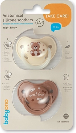 W opakowaniu znajdziesz klasyczny smoczek do użytku dziennego oraz nocny smoczek ze świecącym uchwytem, który łatwo odnaleźć w ciemności. Miękki, trwały i hipoalergiczny silikon bez BPA jest delikatny dla dziąseł, cienka szyjka zmniejsza nacisk na ząbki, a smoczek można łatwo wygotować i utrzymać w czystości.