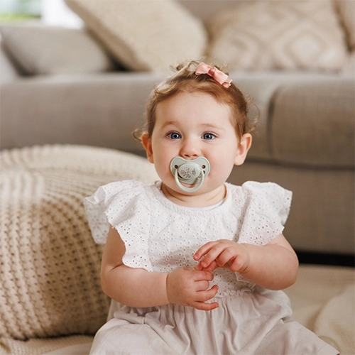 Wypukła górna i spłaszczona dolna część wspierają prawidłowe połykanie, ułożenie języka oraz rozwój podniebienia i zgryzu. Delikatny silikon jest łagodny dla dziąseł i pierwszych ząbków.