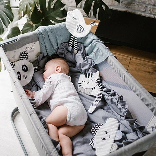 Czarno-białe elementy przyciągają uwagę noworodków i pomagają w koncentracji w kluczowym okresie pierwszych miesięcy.