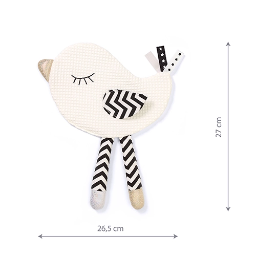 Przytulanka Little Birdie z kolekcji BabyOno Blink&Smile łączy miękkość, bezpieczeństwo i stymulację sensoryczną, którą maluszki uwielbiają. Kontrastowe czarno-białe elementy przyciągają uwagę noworodków, a miękkie tkaniny i metki zachęcają do eksploracji paluszkami. Lekka i łatwa do chwytania forma sprawdzi się w wózku, łóżeczku i w podróży.