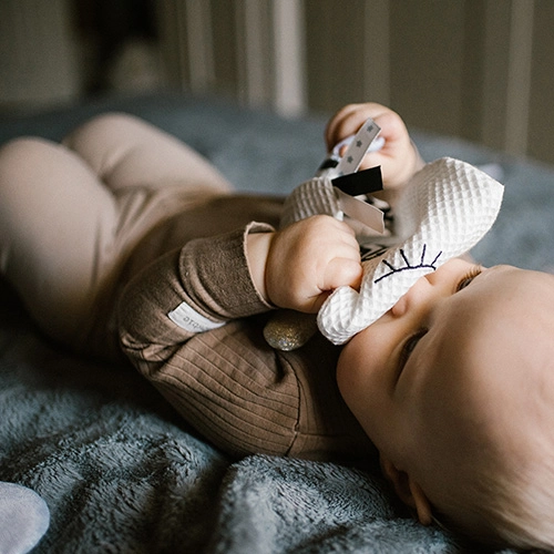 Po chwyceniu zabawka wydaje delikatny dźwięk, a różnorodne faktury i metki wspierają odczucia dotykowe oraz koordynację ręka–oko.