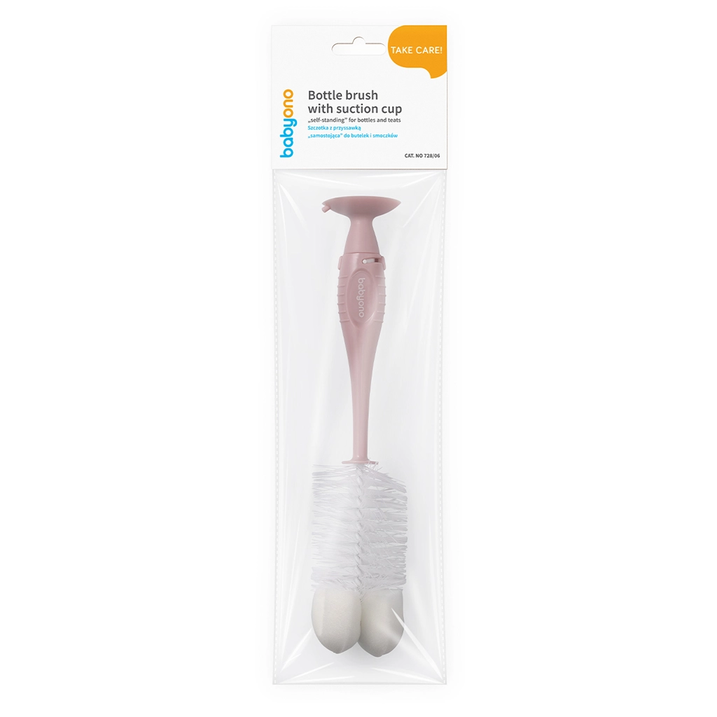 Praktyczna szczotka BABYONO do butelek i smoczków z przyssawką ułatwiającą odkładanie i suszenie. Ma miękką gąbkową końcówkę do dokładnego czyszczenia dna, ukrytą miniszczoteczkę do smoczków w rękojeści oraz wygodny, ergonomiczny uchwyt dla pewnego trzymania.