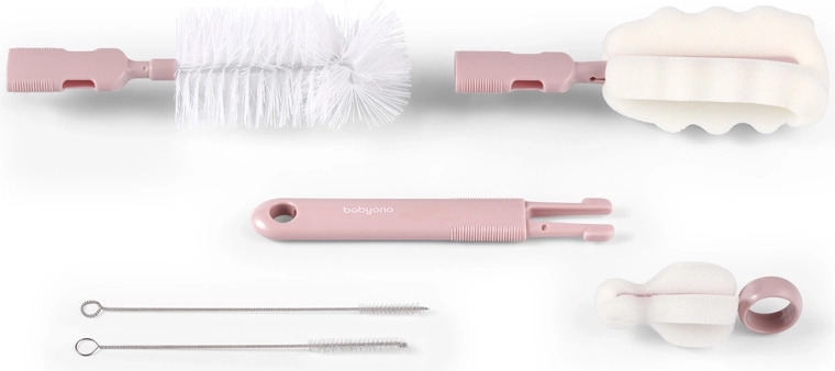 Zawartość zestawu: szczotka do butelek, gąbka do butelek, gąbka do smoczka, 2 szczoteczki do słomek i rurek.