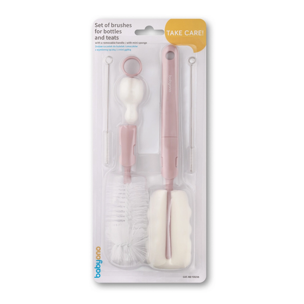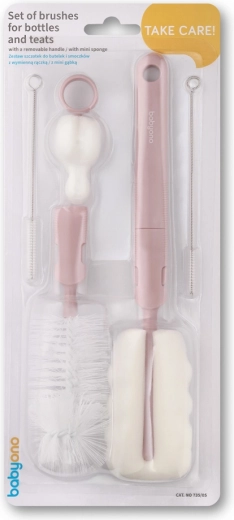Zestaw szczoteczek BABYONO został zaprojektowany do łatwego i higienicznego czyszczenia wszystkich akcesoriów do karmienia i pielęgnacji niemowląt. Wymienne szczoteczki i gąbki dopasujesz do kształtu butelki i smoczka, dzięki czemu usuniesz zanieczyszczenia nawet z wąskich szyjek i rogów. Odpinana rączka i otwory do zawieszania zapewniają komfortową obsługę i szybkie wysychanie.