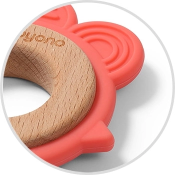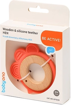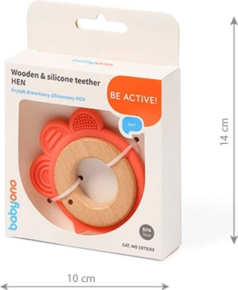 Gryzak BabyOno Hen łączy naturalne drewno bukowe z miękkim silikonem przeznaczonym do kontaktu z żywnością, zapewniając delikatny, a jednocześnie skuteczny masaż dziąseł. Teksturowane wypustki przynoszą natychmiastową ulgę, wspierają percepcję zmysłową i ułatwiają chwytanie małymi rączkami. Motyw zwierzątka jest atrakcyjny dla dzieci i zachęca do zabawy.