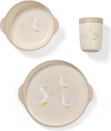 Talerz, miska i kubeczek mają antypoślizgową powierzchnię dna, która ogranicza przesuwanie się po stole i zmniejsza ryzyko rozlania.