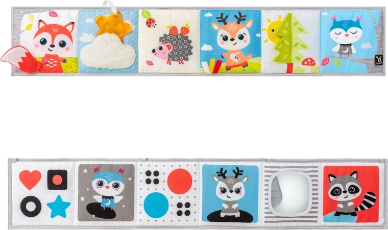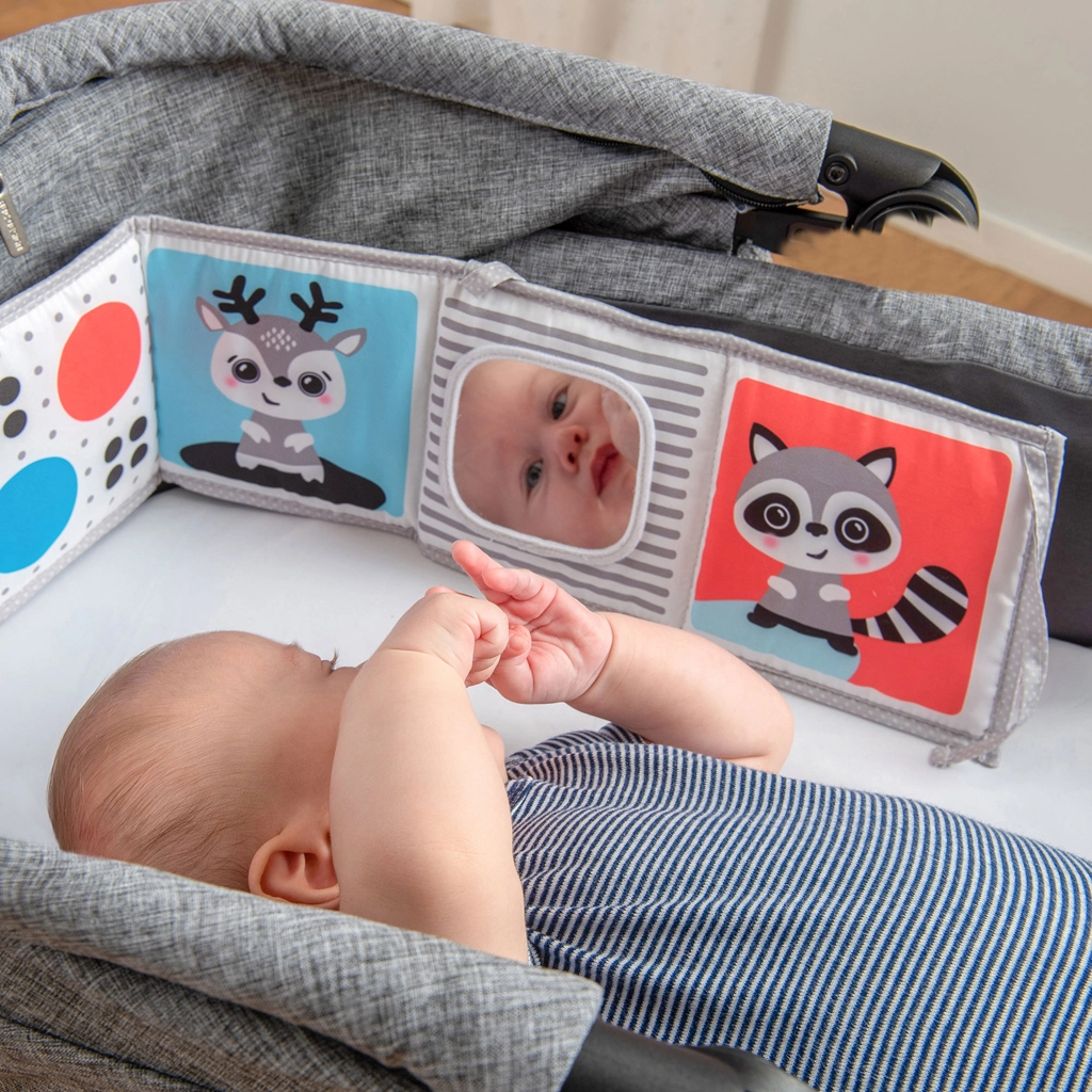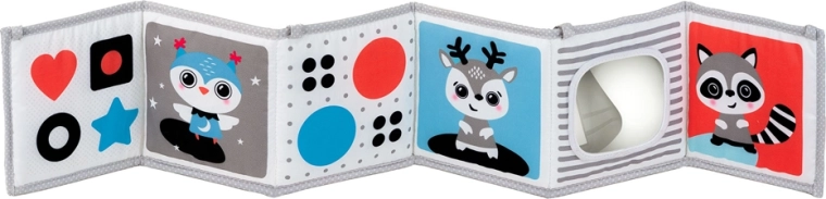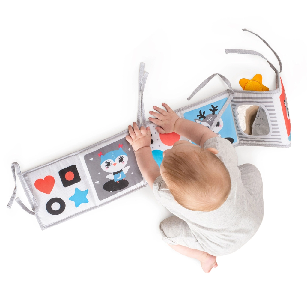 Miękka tekstylna książeczka dla niemowląt od urodzenia wspiera stymulację wzrokową, czas na brzuszku oraz sensoryczne odkrywanie. Oferuje czarno-białą stronę dla noworodków i kolorową stronę dla kolejnych etapów rozwoju, duże bezpieczne lusterko, szeleszczące i dotykowe elementy oraz możliwość postawienia, ułożenia na płasko lub przywiązania do łóżeczka czy wózka. Łatwo się składa i można ją zabrać ze sobą wszędzie.