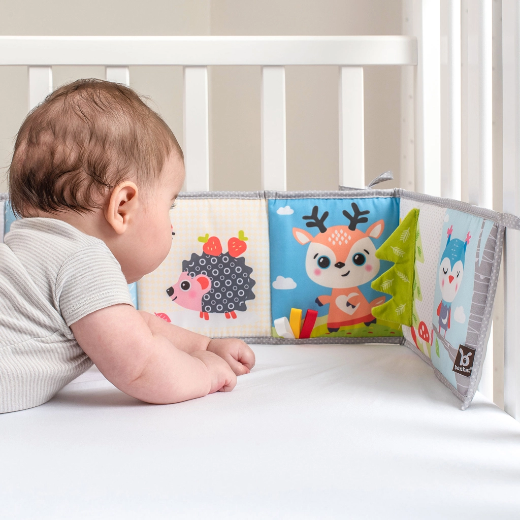 Dwustronna aktywna książeczka BENBAT Leśni przyjaciele rośnie razem z Twoim maluszkiem. Strona o wysokim kontraście (czarno-biała) idealnie stymuluje wzrok noworodka, natomiast kolorowa strona z wesołymi zwierzątkami wspiera uwagę i koncentrację na wyższych etapach rozwoju. Miękkie materiały, szeleszczące strefy, dotykowe tasiemki i duże lusterko zachęcają do eksploracji i wspierają małą oraz dużą motorykę.
