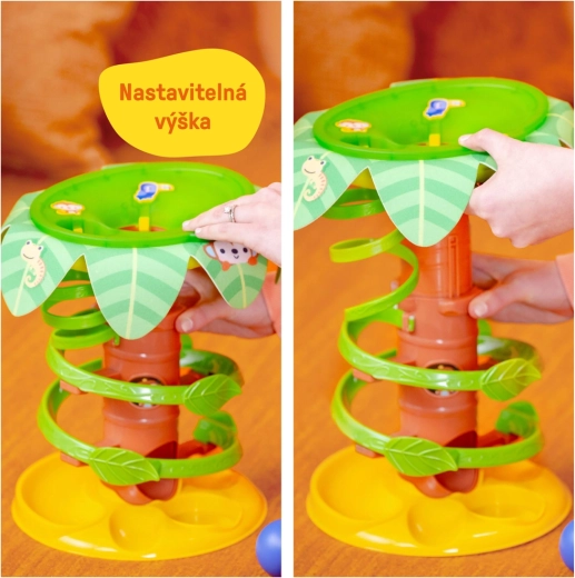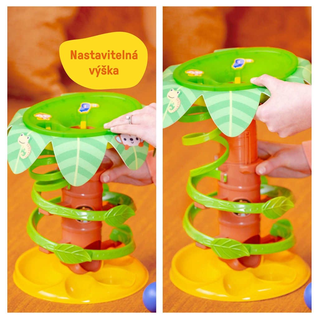 - 50+ melodii, dźwięków i efektów świetlnych; świecące muzyczne przyciski (małpka, tukan); spiralny tor kulkowy; wrzucanie do korony drzewa
