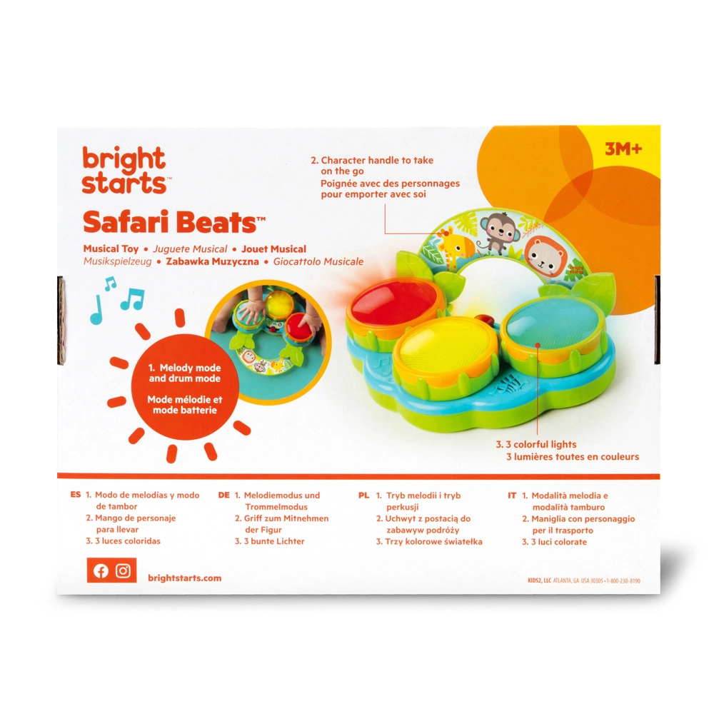 Safari Beats pomaga rozwijać motorykę małą i dużą, koordynację ręka–oko oraz percepcję sensoryczną. Zabawka jest gotowa do natychmiastowej zabawy – w zestawie znajdują się wymienne baterie AA.