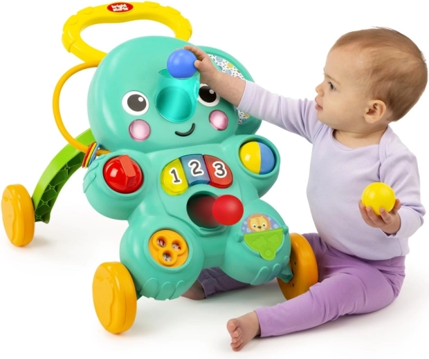 Chodzik BRIGHT STARTS Stroll’n Roll 2w1 przynosi dzieciom radość z zabawy i pewność siebie przy stawianiu pierwszych kroków. W trybie siedzenia maluchy odkrywają klawisze pianina z liczeniem 1–2–3, elementy obrotowe, grzechotki i książeczkę; w trybie chodzika motywują je światła i dźwięki aktywowane wypuszczaniem piłeczek trąbą słonia.