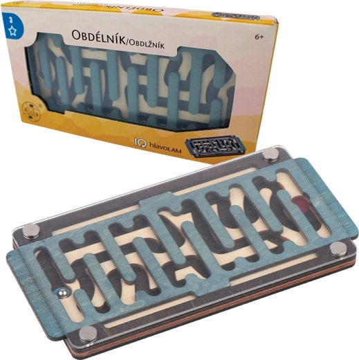 Zawartość opakowania: drewniana rama i zestaw kolorowych elementów do ułożenia w kształt prostokąta.