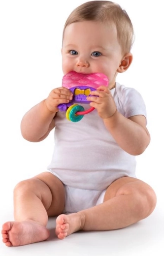 Różne faktury i kolory stymulują zmysły, dwa kółeczka na uchwycie dzwonią i zachęcają do odkrywania. Bezpieczne materiały i łatwa pielęgnacja sprawiają, że ten gryzak to praktyczny kompan w domu i w podróży.