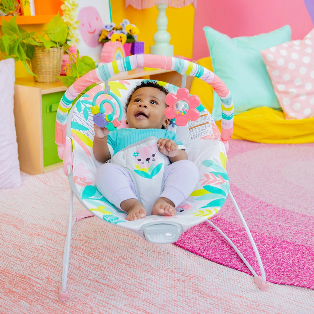 Uspokój maluszka i zapewnij mu radosne chwile w wygodnym leżaczku Bright Starts Rainforest Vibes. Oferuje delikatne wibracje, mięciutkie, głębokie siedzisko oraz odpinaną pałąk z dwiema zabawkami wspierającymi rozwój zmysłów. Dzięki antypoślizgowym nóżkom i trzypunktowemu pasowi siedzenie jest bezpieczne, a kolorowe motywy dżungli zachęcają do odkrywania i zabawy.