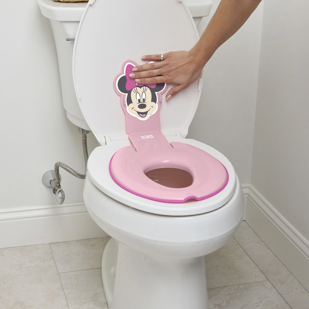 Naklejana redukcja na WC Bright Starts Flip & Sit z uwielbianą MINNIE MOUSE pomaga dzieciom bezpiecznie i wygodnie przejść do korzystania z toalety dla dorosłych. Montaż jest błyskawiczny – dwie silne taśmy klejące mocują siedzisko bezpośrednio do istniejącej deski, bez wiercenia i narzędzi. Gdy nie jest potrzebne, po prostu odchylasz je do góry, dzięki czemu nie zajmuje miejsca.
