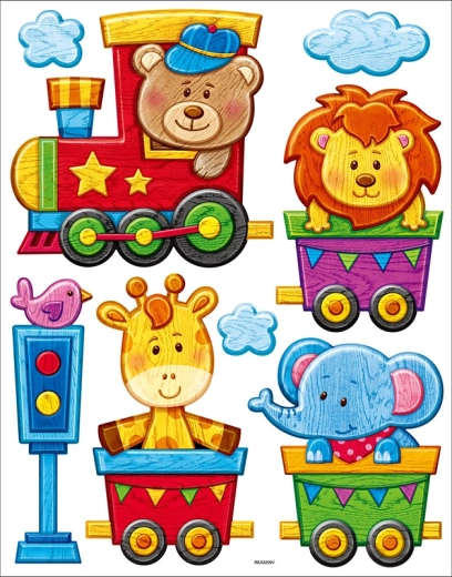 Uruchom wyobraźnię na pełnych obrotach! Uroczy pociąg prowadzony przez misia wiezie słonia, żyrafę i lwa, uzupełniony o semafor, dym z komina i ptaszka nad lokomotywą. Ta dekoracja ścienna wnosi do pokoju radosną atmosferę przygody i jednocześnie pomaga dzieciom poznawać świat zwierząt.