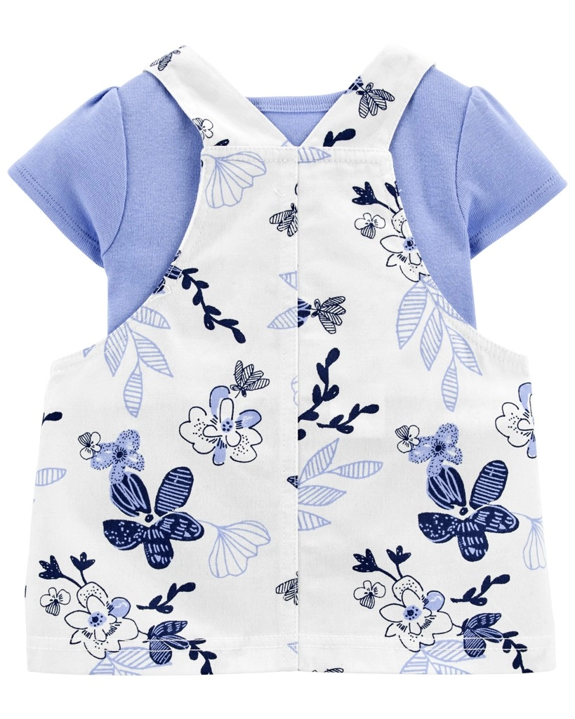 Ten 2‑częściowy zestaw dla niemowlęcia łączy praktyczność i styl. Miękkie bawełniane body w subtelnym fiołkowym odcieniu ma wzmocniony dekolt i napy w kroku dla szybkiego przewijania. Leciutka biała sukienka na szelkach z niebieskim kwiatowym nadrukiem wygodnie warstwuje się na body i dzięki guziczkom na ramiączkach łatwo ją dopasować.
