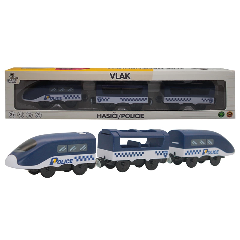 Przeżyj dynamiczną jazdę z pociągiem Babu w policyjnym wzorze, który po naciśnięciu przycisku jedzie do przodu. Magnetyczne wagony dla łatwego łączenia, kompatybilność z drewnianymi kolejkami oraz wytrzymała, plastikowa konstrukcja gwarantują godziny kreatywnej zabawy dla dzieci od 3 lat.