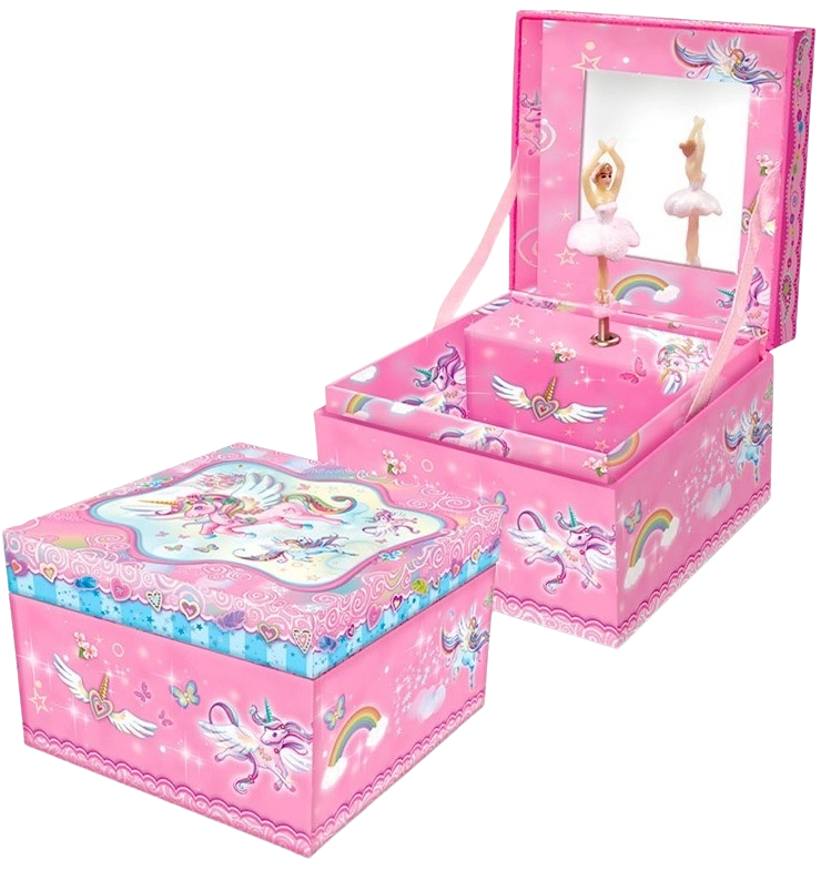 Ta urocza szkatułka w delikatnych kolorach i z dopracowanymi detalami przynosi dzieciom radość oraz praktyczne zastosowanie. Po otwarciu wieczka uruchamia się mechanizm grający z przyjemną melodią, która dopełnia magiczną atmosferę motywu jednorożca i baletnicy.